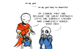 alassdragons Uncategorized 30th Nov 20175th Dec 2018 1 Minute zarla-s: I love Sans’s (apparently) sincere love of socks and sock collecting. The skelebros are such losers. Share this: Click to share on X (Opens in new window) X Click to share on Facebook (Opens in new window) Facebook Like Loading... Related Published by alassdragons View all posts by alassdragons Published 30th Nov 20175th Dec 2018