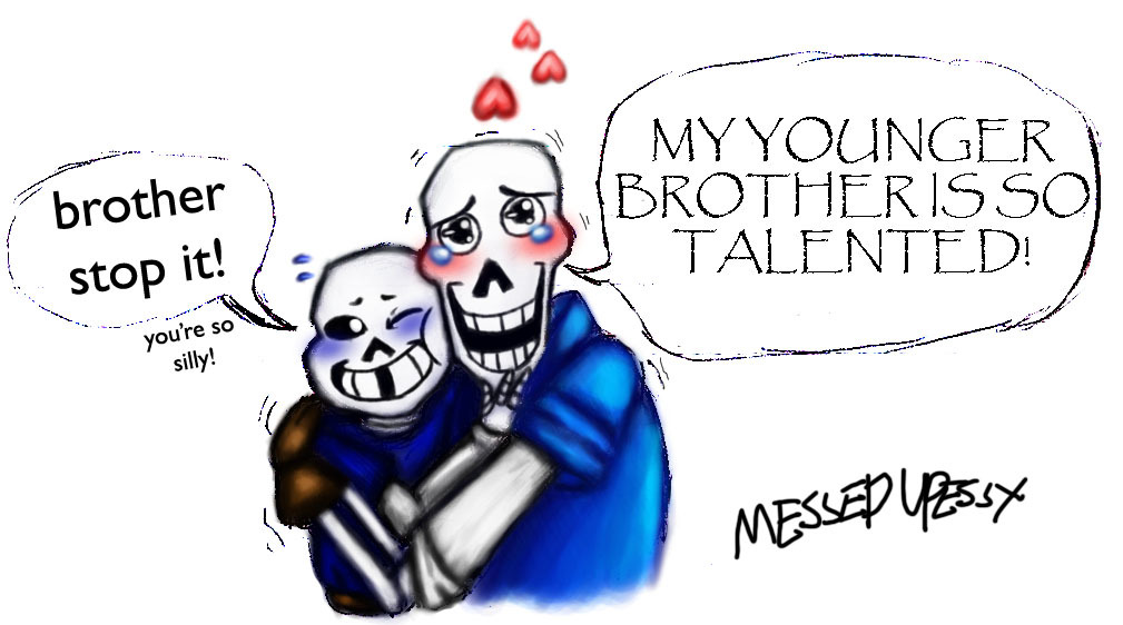 Another old TraverseTale pic, of a young Hobb and his older brother who I have nicknamed Knight, as in this AU Papyrus is the older brother, or should I say… was pfftt, because I can! Anyhow this was pretty much how these two were when Hobb was little, as he was one smart little kid who was constantly studying stuff while his older brother was out training to become a proper knight, which is why he is nicknamed Knight, but he was overly proud over his younger brothers smarts and took every chance he could to tell Hobb so, causing little Hobb to get embarrassed and telling his brother how silly he is and stuff because it is cute af <: