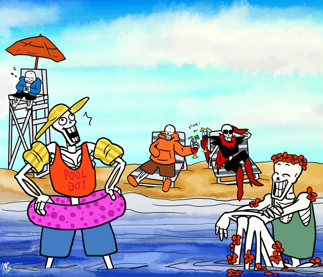 My secret santa gift for @mcfudgie! They wanted a sweet picture of some Papyruses having a nice time at the beach, I just wish I was able to add more Paps! I also tossed a sleepy sans in there to keep an eye socket out for them 😉