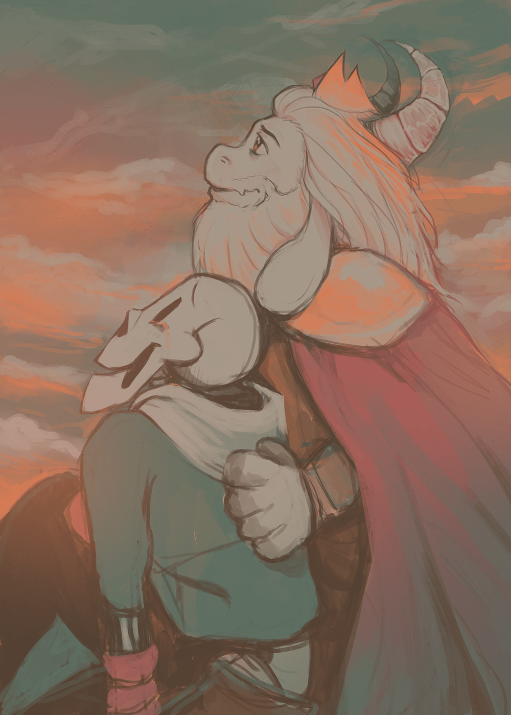 This went through a few different phases Originally papyrus was kneeling because he was being knighted, but i liked the idea of them sitting on the grass together looking at the sky, so I switched it to that. When I threw a slightly small hoodie on Papyrus purely for the aesthetic it reminded me of an idea I had for a Disbelief AU where Chara/Frisk decide to surrender after Papyrus tells them that even now, he still believes in them.