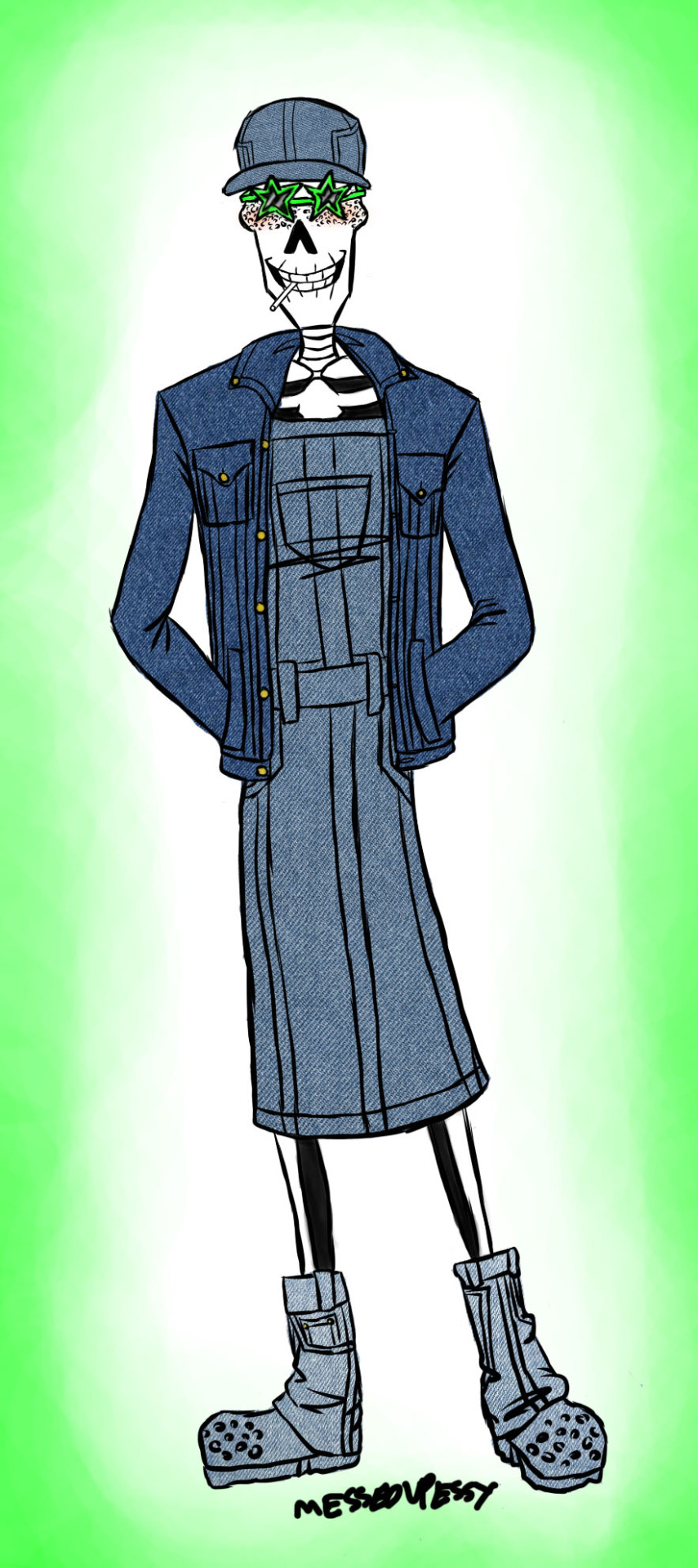 Not super happy with it tho as I wasn’t drawing as properly/detailed as I could which you can see on the lines, especially on like the glasses which I now regret not putting denim on there shoulda been denim on the glasses too but can’t be bothered to change it, I really like this outfit tho it’s so horrible it’s beautiful, and I just love denim overalls and dresses and jackets they’re so darn good, and I actually got some sketches of Stretch wearing more of these though not as shitposty which I will show ya all sometime pfft, not so happy with his face either something is wrong with his smile like frikking usual, I like how the denim turned out tho, and the jacket looks good alongside the dress, and I just now had to shrink the pic a bit as for some reason it turned fucking blurry here ffs and it still is blurry and I don’t care anymore fuck u tumblr