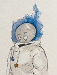 My monstersona boy is finally done, hello. So the idea is he’s got a nebula star for a head with this cosmic aura radiating from him constantly, wherein the colour is mood dependent but is usually blue or yellow (only 2% chance he will get annoyed enough turn red). He looks sad but that’s just the shape of his eyes, I promise he feels over the moon all the time