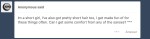 Anon 1: Oh my gosh, I get it. It doesn’t happen so much anymore, but when I was little I got teased for it all the time… Which is so weird? Why do people even tease others for being a little bit smaller or having shorter hair? I mean yeah, shorter is better I can play hide and seek better and am less likely to be picked out in class not to mention having shorter hair means people don’t yank on it randomly; their the one’s missing out friend!!