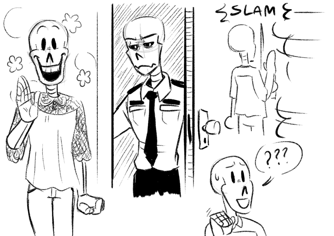 Edge glanced over Papyrus’ shoulder. “Sans.” The shorter skeleton shot him a