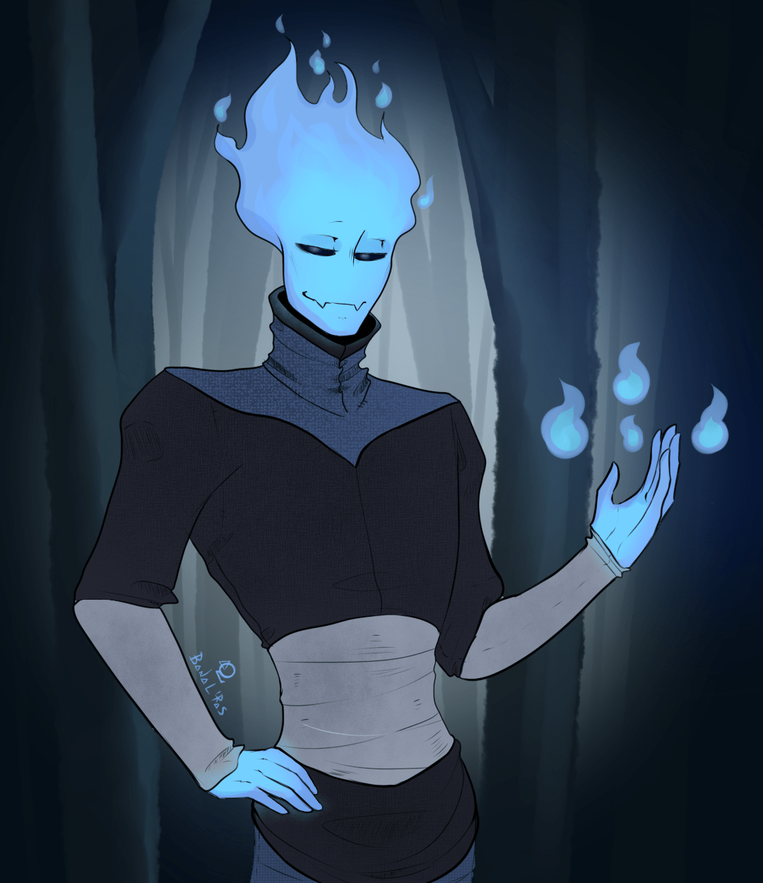 The Innkeeper. Grillby. Dark wood au. Fire elemental. Monster. Indifferent for humans and witches. Friendly for monsters. Known as a strong, fair warrior who trained many of great soldier. He was Gaster’s Guardian for many centuries. During the Last war had to pass his titul to Undyne so she could look after new Keeper and Grillby could stay with Gaster while the last one was recovering his powers. Nowadays is known as owner of the biggest and only tavern out of seasons and lamplighter – any blue lights in the forest for sure is his job. As everyone knows, and no one remembers at the same time, somewhere under his tavern closer to the core, sleeps Gaster, and Grillby still guards his sleep. Grillby is very calm, what is not commun for fire element. He doesn’t speak a lot and doesn’t speak with strangers at all. As he’s not a guardian any longer, Grillby uses fire magic instead of his sword. He often jokes that he doesn’t remember how to fight at all. (don’t trust him)