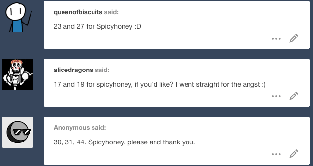 This answer is getting a bit long aaah, but I really wanted to add this last bit. As far as their sex life goes, their roles tend to shift a bit from what they might be under ‘normal’ circumstances. While Edge normally prefers to dom (he feels more at ease when he’s in control), with Sans, he likes to be able to let go, and let Sans take the lead. It takes a while, but being with a Tale ‘verse monster gives him a little peace of mind. He feels safer around Sans, and is less reluctant to let Sans take control. Similarly, Sans is normally too lazy to dom. He likes to lie back and let his partner do all the work (whichever set of genitals he forms), but with Edge, he actually enjoys seeing him fall apart, and is happy to put in the work (for a change).