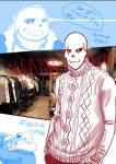 And I am not sure what that dialogue is but it’s all I could think off, or well not really first I was like Sans has captured Edge in bed for over 2 hours or something and Edge is trying to get up because he got work and shit but eventually relents and gives up and cuddles some more, then the idea for Sans smelling bad popped up, but didn’t go with it immediately as I then was like this looks a bit like angst maybe Sans comforting the edgelord or something but nah couldn’t get the words to work, and then also something with Edge trying to ask sans something but he has fallen asleep so he just whispers lazybones really affectionate but eventually went with the stinky hoodie idea instead <: