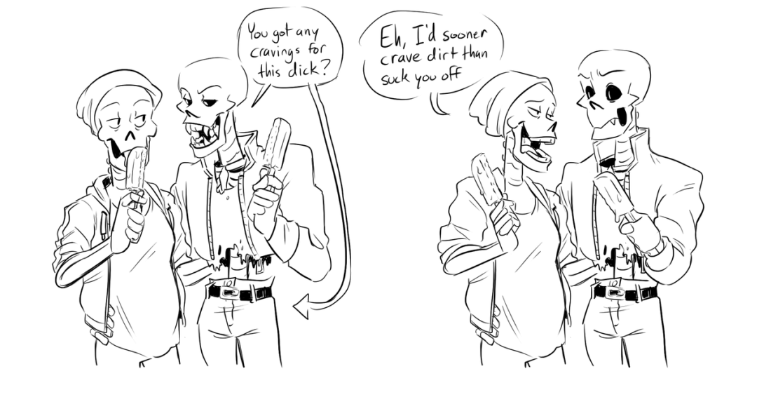 The Fell skeleton laughs and playfully nudge the other, tossing the barely used cig away. Edge grabs Rus’s hand and leads him back inside for a good night’s rest. After that night, Edge never touches a cigarette again.