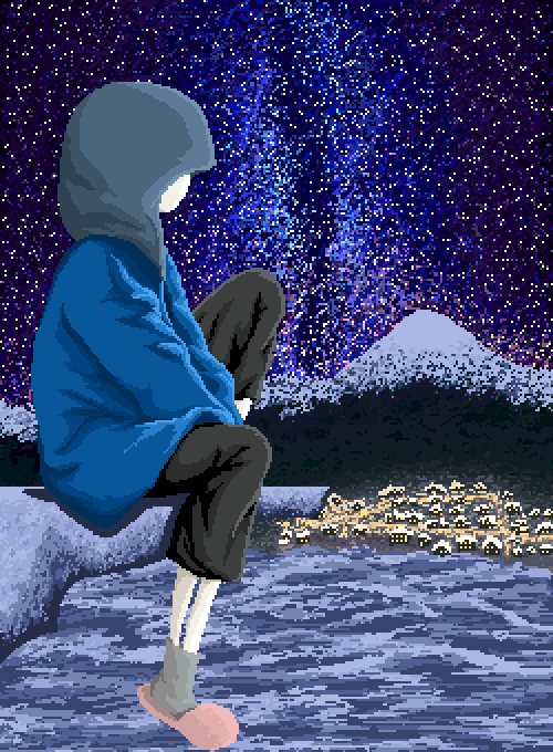 Okay, this looks amazing??? Wow. You blew me away, friend! That sky is dazzling. I can only imagine how long this took to do. All those stars, the shading, the snow…all these little details. This is a work of art. Geeze. Pixel art is difficult, and the amount of patience to do this has to be high. You have some supreme talent here. This blows my mind. The balance of light and dark colors in here is extraordinary. What a piece!