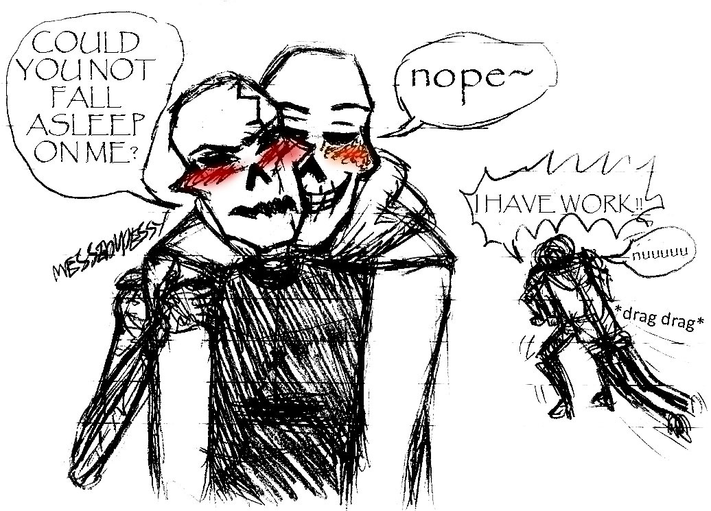 Have some more spiceyhoney that I sketched around the same time as the other one, as they are on the same page <: just Stretch been a good boyfriend by stopping Edge from going to work as Edge keeps on overworking himself af by falling asleep on him, eventually dragging Edge onto the floor after Edge dragged Stretch with him a bit in an attempt to get him to let go where Edge eventually gives up because Stretch is right he needs a break or something like that xD